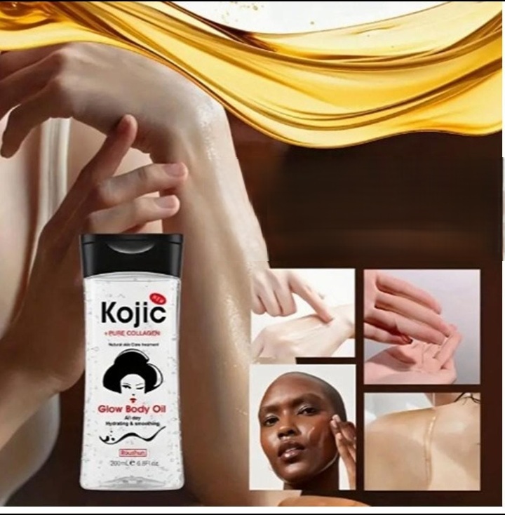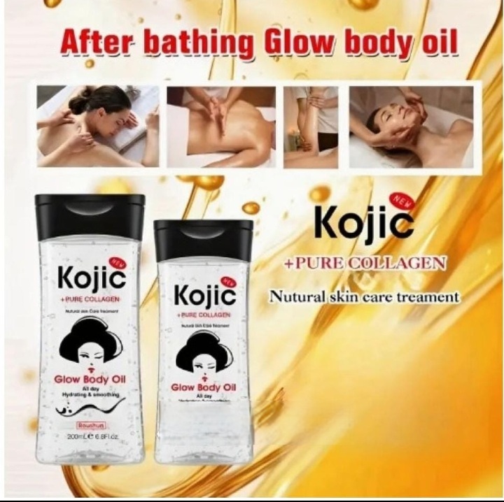 Kojic Glow Body Oil (200ml) + pure collagen for skin lightening, hydrating, and smoothing.
